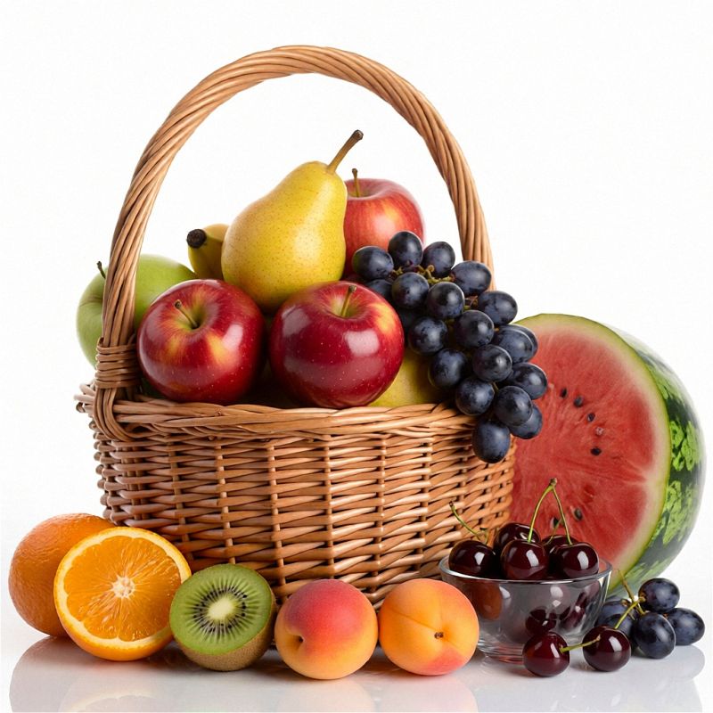 Dejlig frugtkurv med masser af saftig frugt. Helt frisk fra landet hvor solen skinder altid.